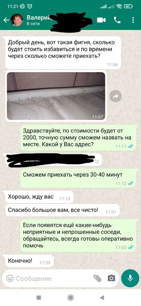 Дезинсекция занимает разное количество времени. Это зависит от площади квартиры или другого объекта, а также от популяции вредителей. В среднем, чтобы обработать однокомнатную квартиру, мы затрачиваем полтора-два часа.