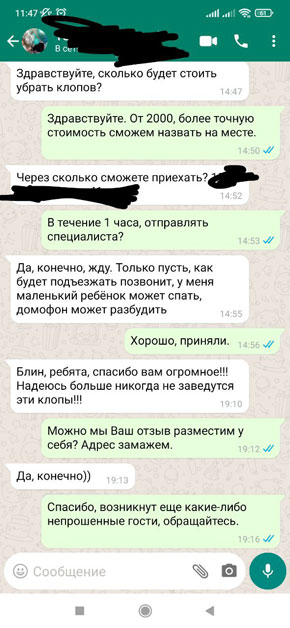 Дезинсекция занимает разное количество времени. Это зависит от площади квартиры или другого объекта, а также от популяции вредителей. В среднем, чтобы обработать однокомнатную квартиру, мы затрачиваем полтора-два часа.